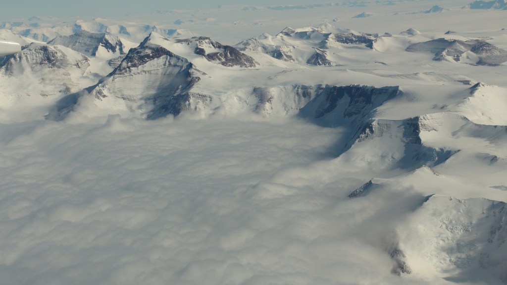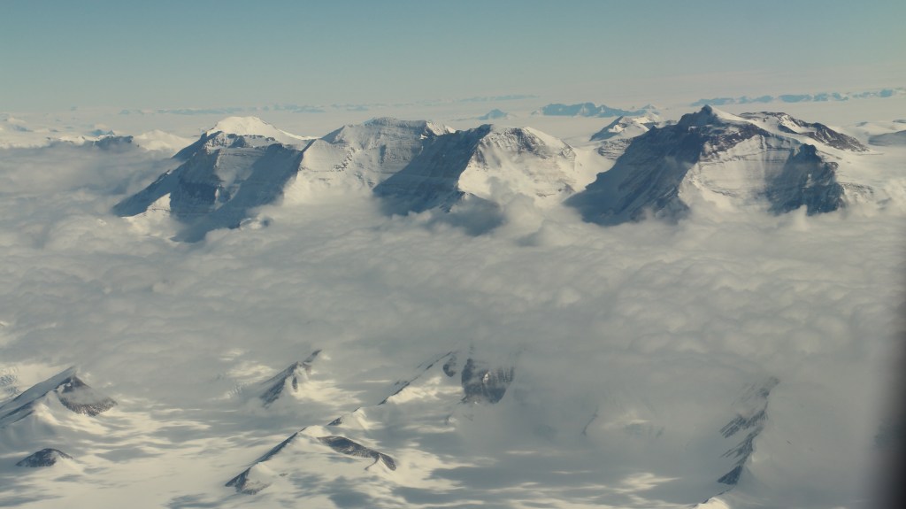 Trans-Antarctic mountains were the next ones and the peaks of the mountains looked very beautiful and perfectly carved. These mountains spread along the continent dividing it into east and west Antarctica. We could see the clouds floating below these mountains.