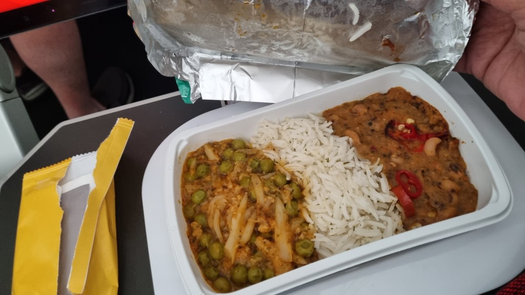 We got two meals on the flight, along with multiple snacks, icecream and a chocolate. While I couldn’t enjoy my first meal, second meal was filling with rice and curries.